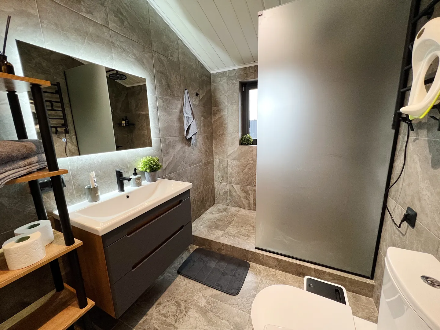 — Санузел с качественной сантехникой, теплыми полами, стиральной сушильной машиной, феном, комплектом полотенец и средствами гигиены
